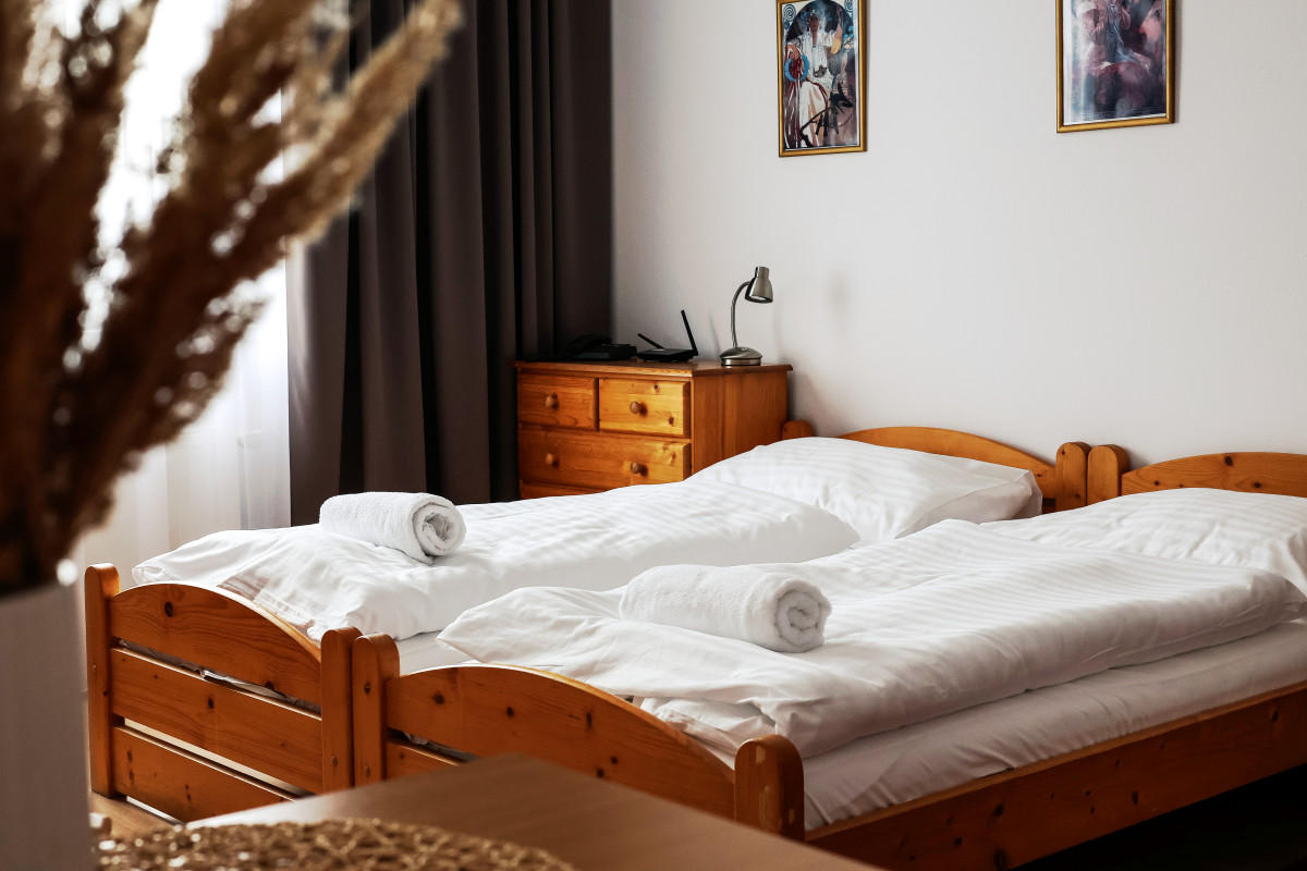 Apartment with a separate kitchenette equipped with basic dishes, cooker, refrigerator, and microwave oven. The apartment consists of an entrance hall, corridor, bathroom with shower and toilet, kitchenette, and a bedroom with 2 separable beds.
